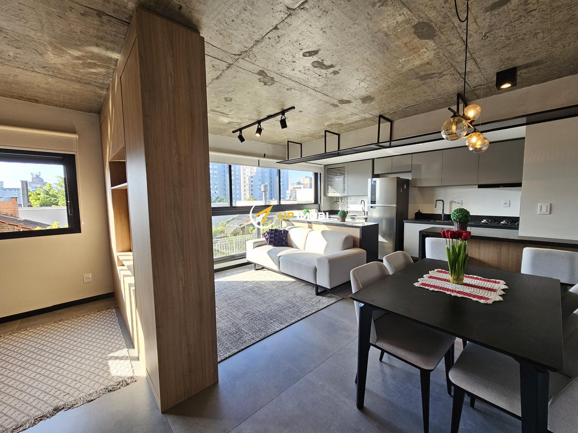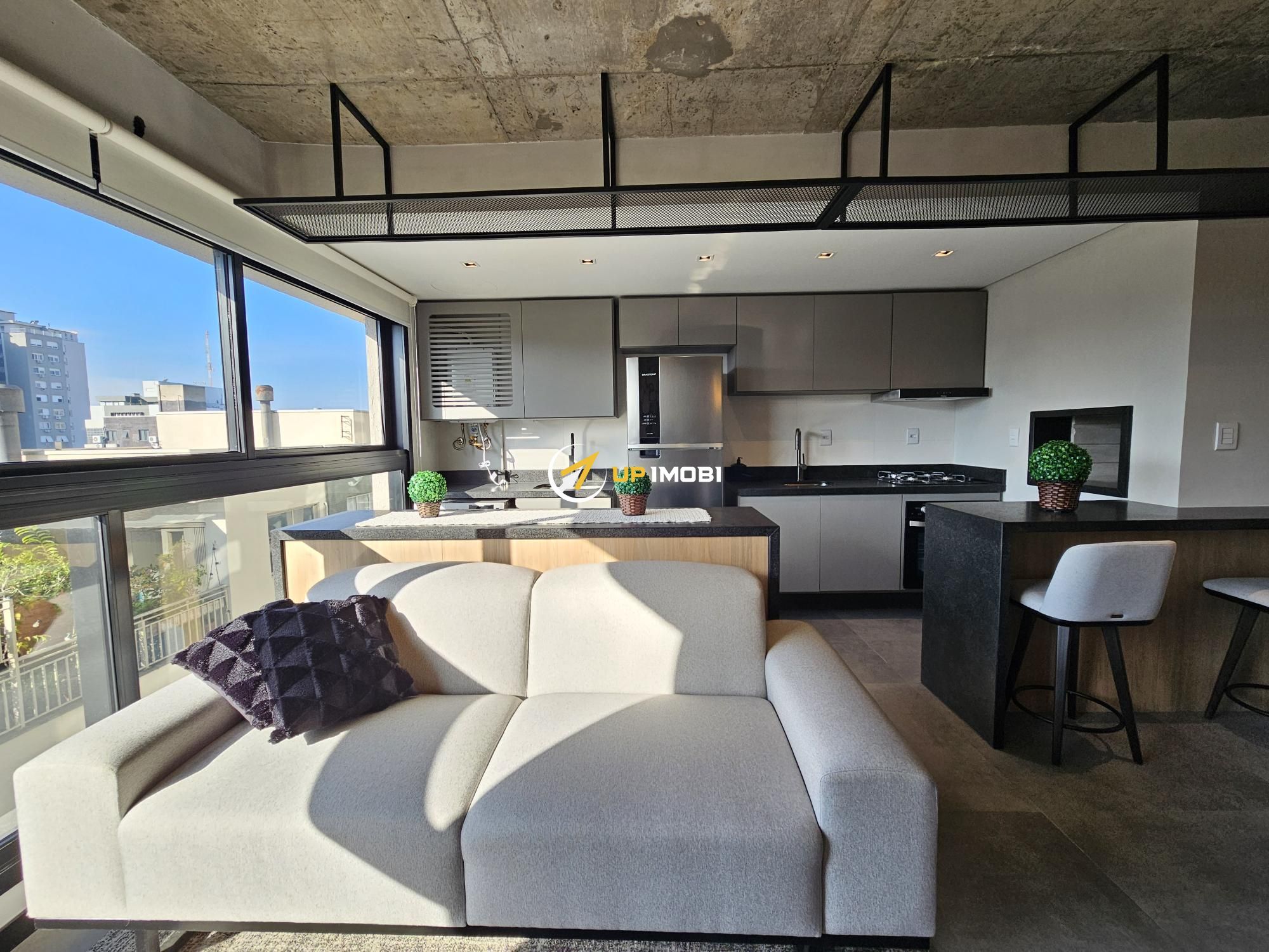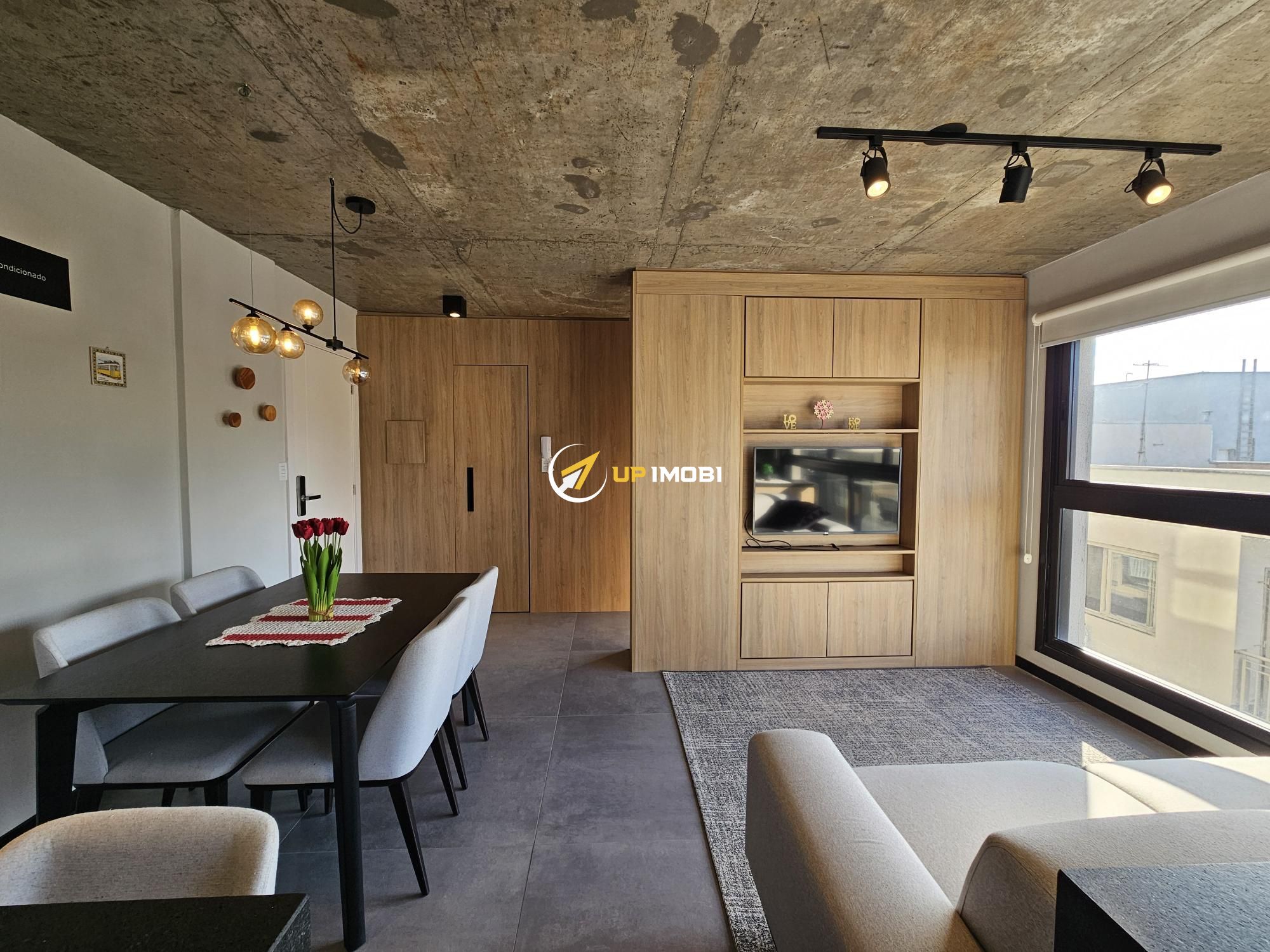 Lindo apartamento tipo studio com 43m2 privativos, 100% mobiliado (era o decorado da construtora). Ampla janela no living, vista definida, sol norte e churrasqueira. Vaga dupla de garagem. Edifício com painéis solares, salão de festas, academia, terraço com parrilla e piscina.