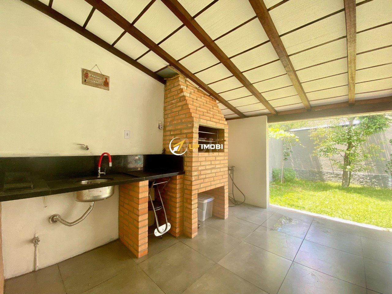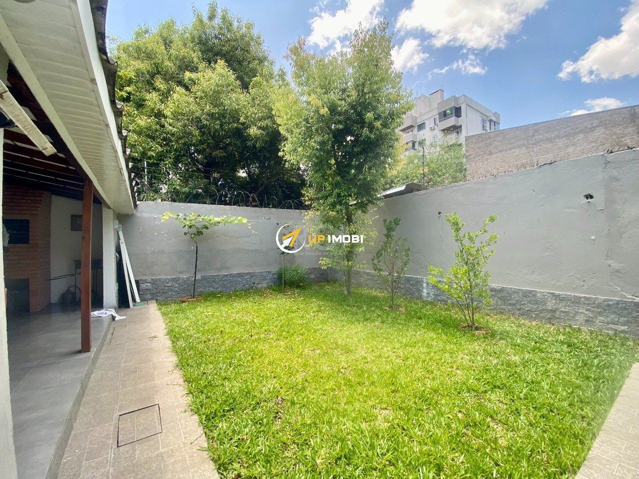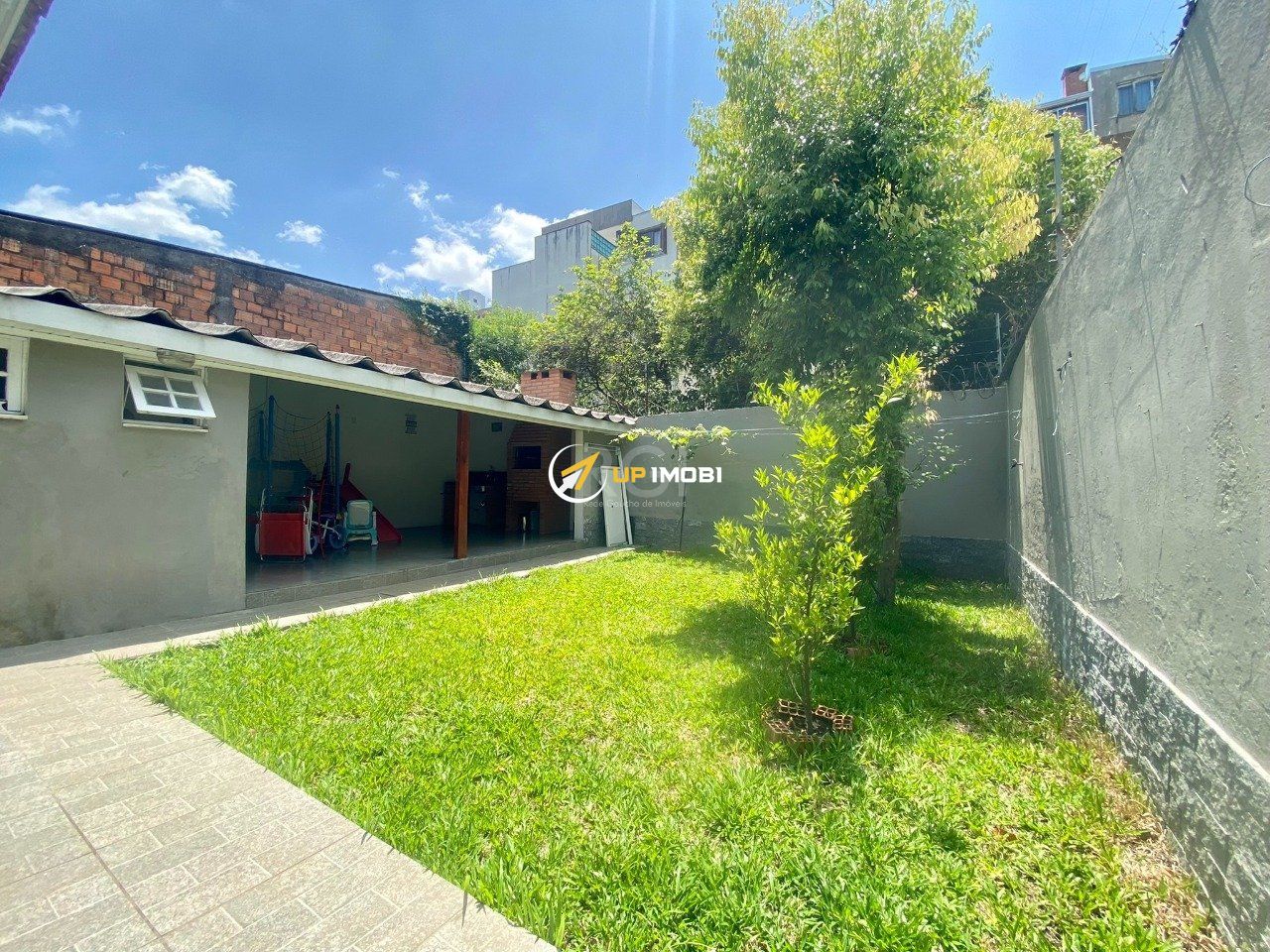 A Casa possui pátios laterais, e pátio atrás com área fechada com churrasqueira e área aberra com grama.