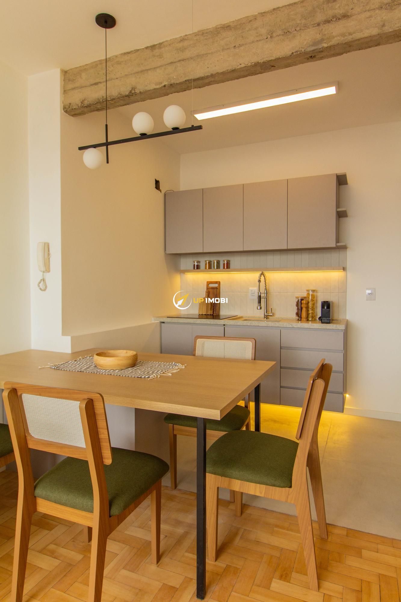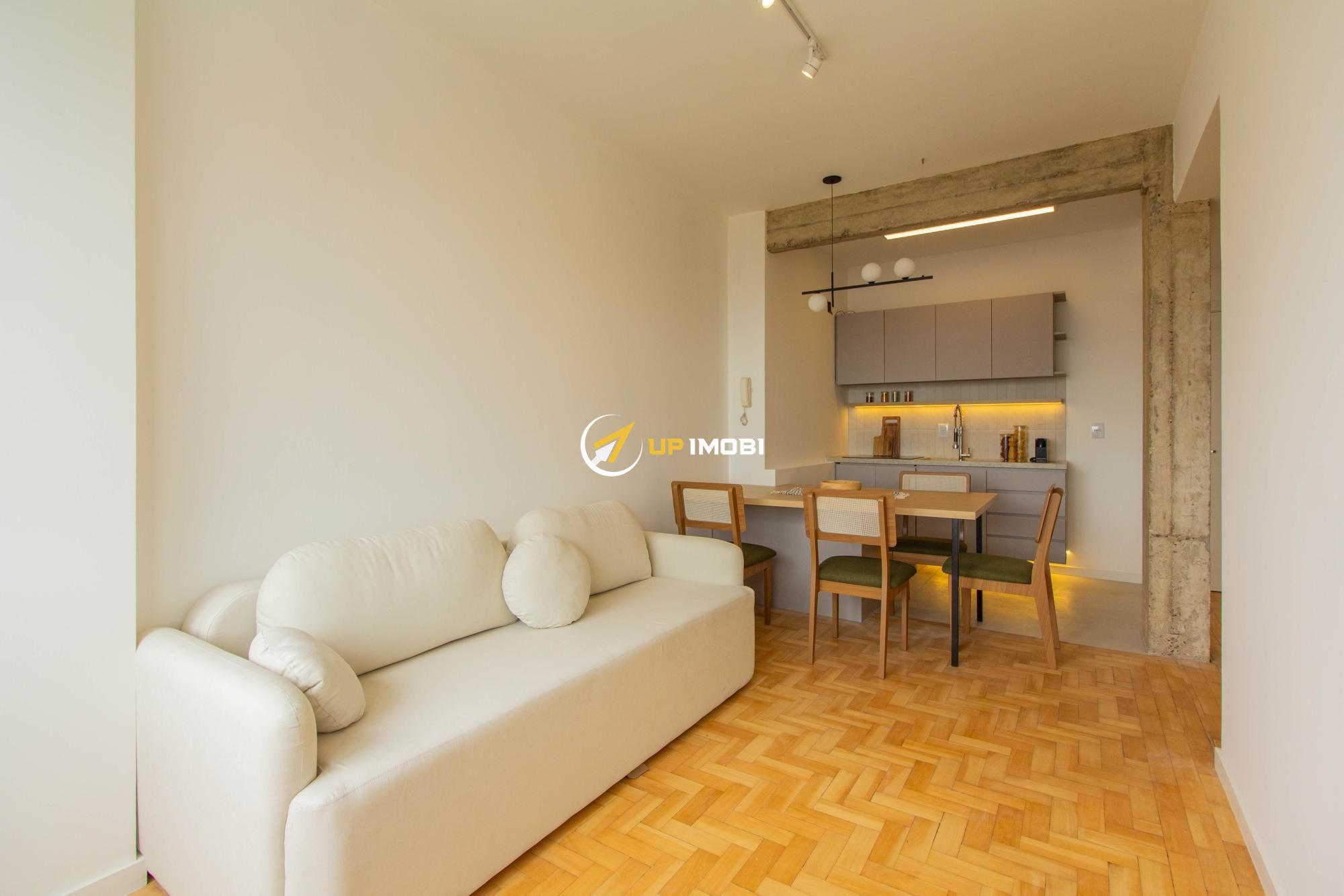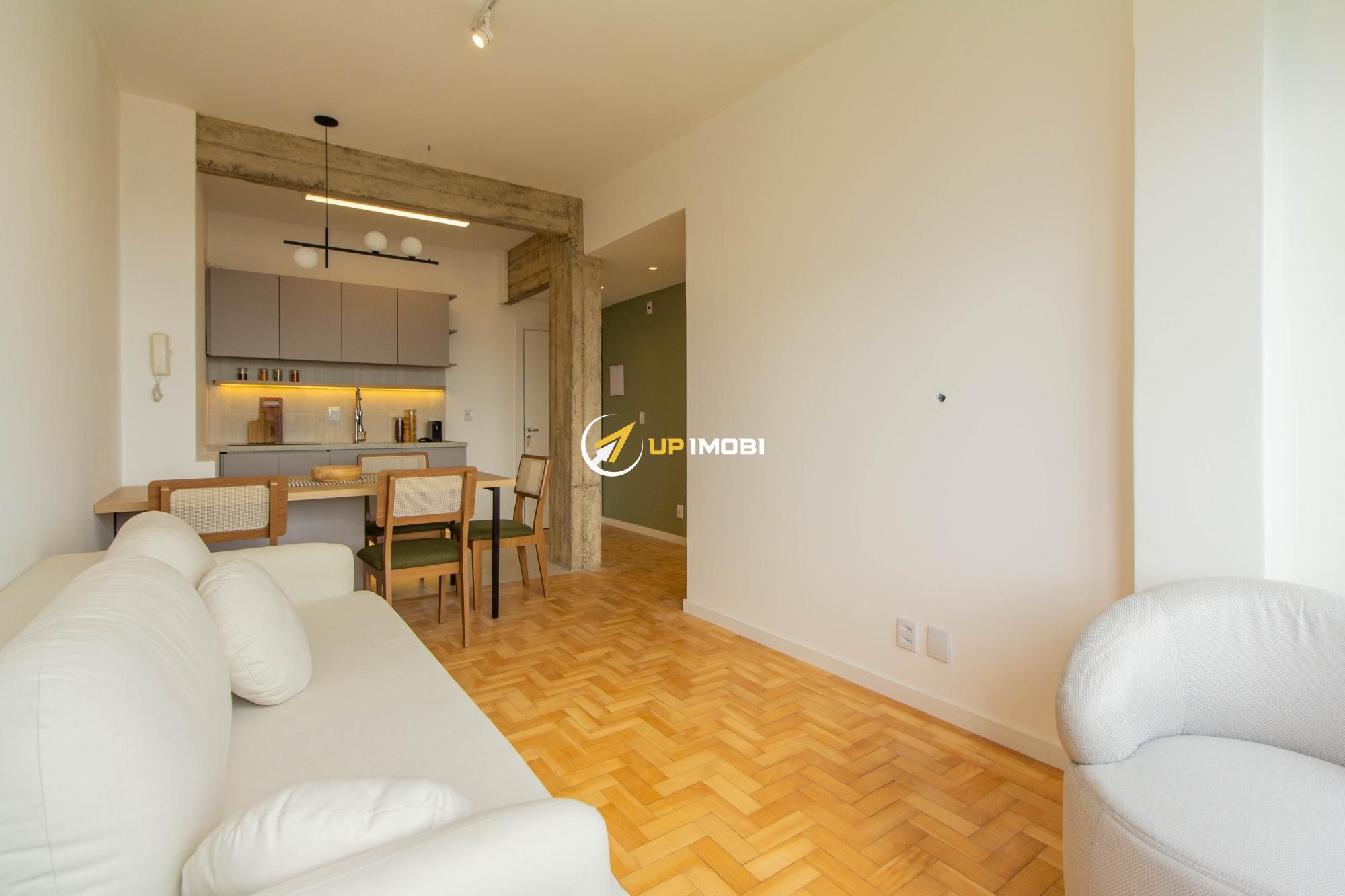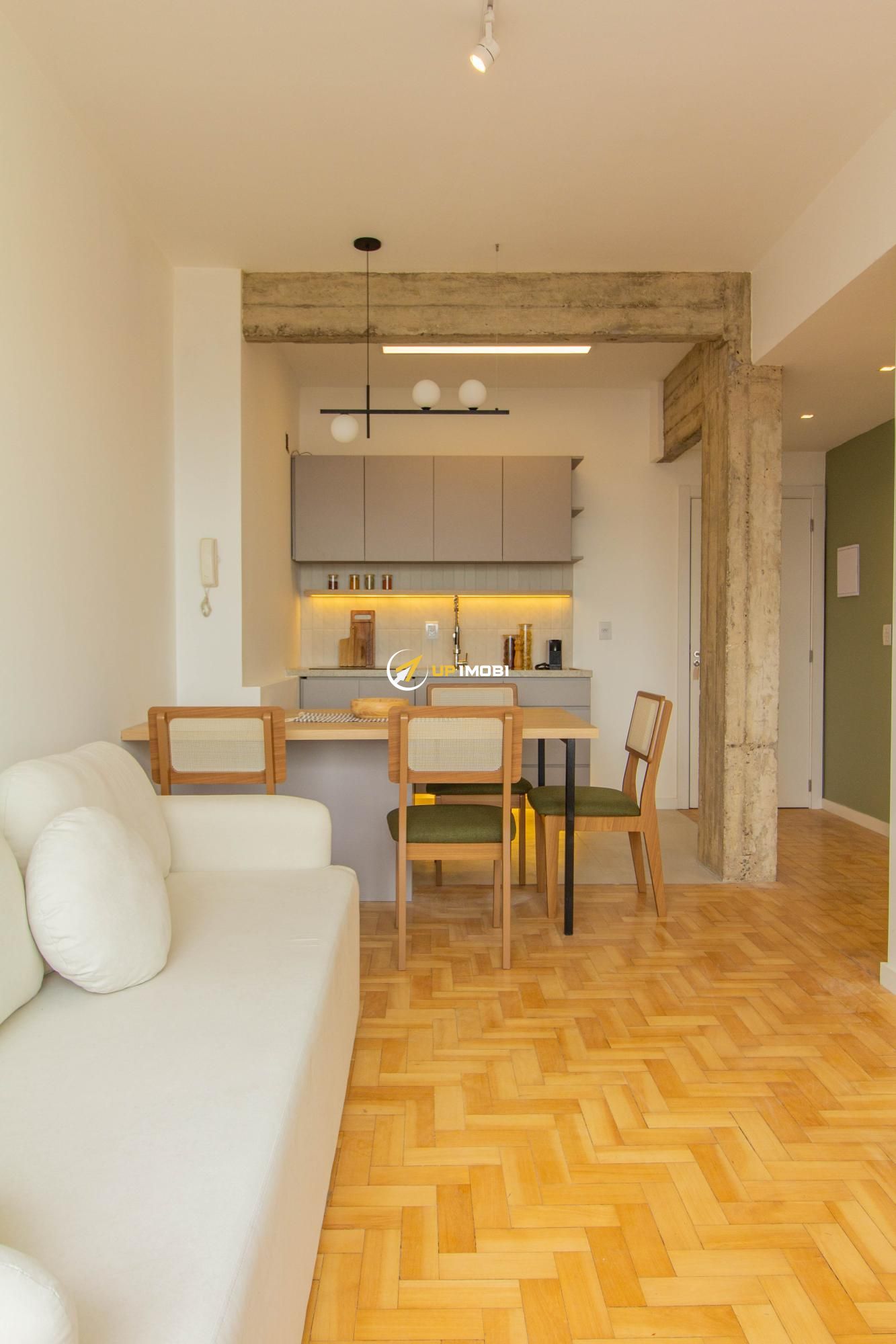 A sala, com piso em parquet, já conta com sofá e poltrona, enquanto a cozinha dispõe de mesa com cadeiras, criando um espaço pronto para viver e receber.