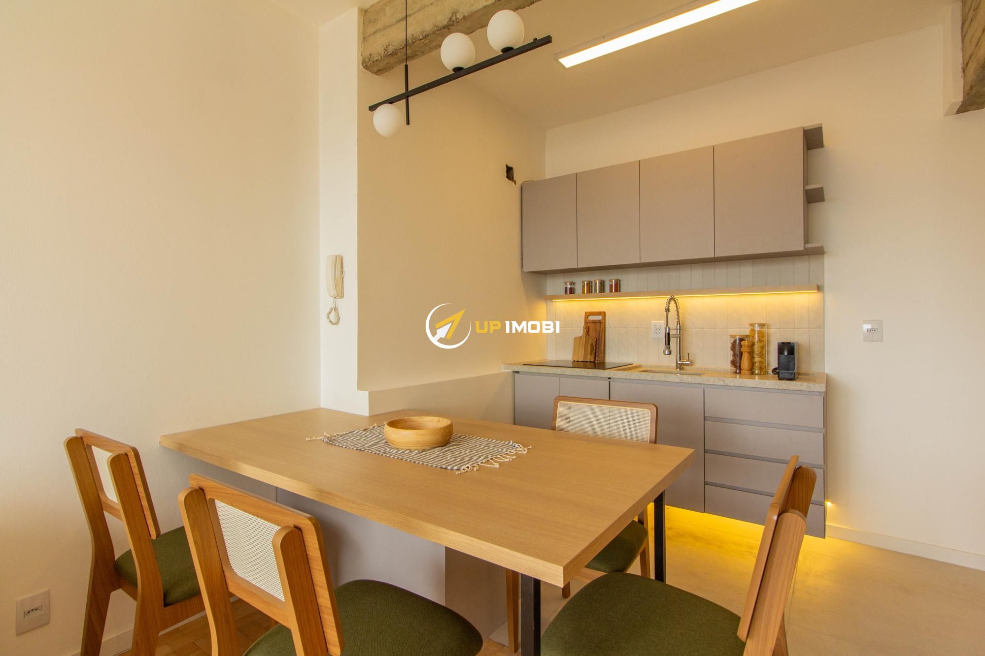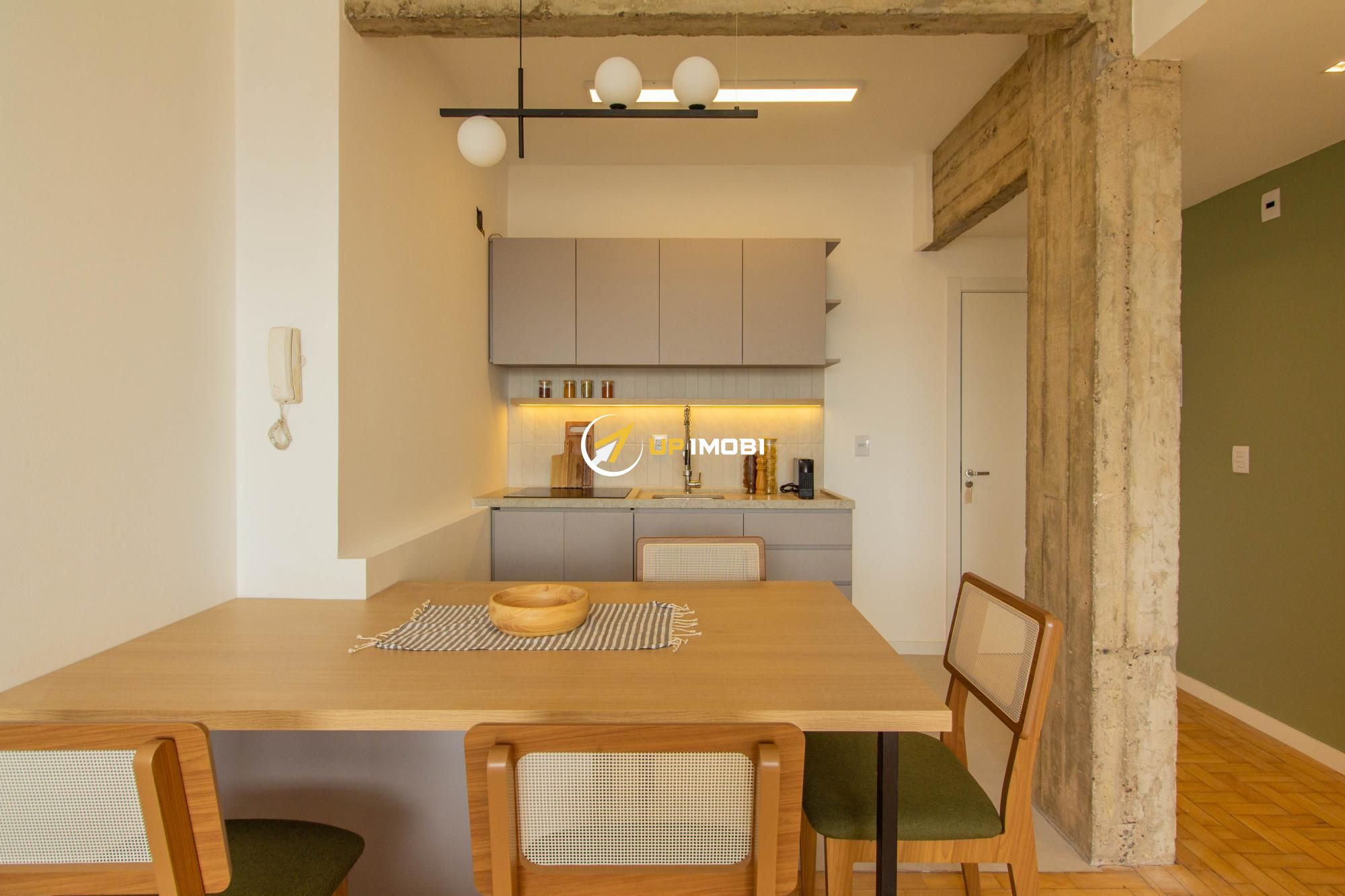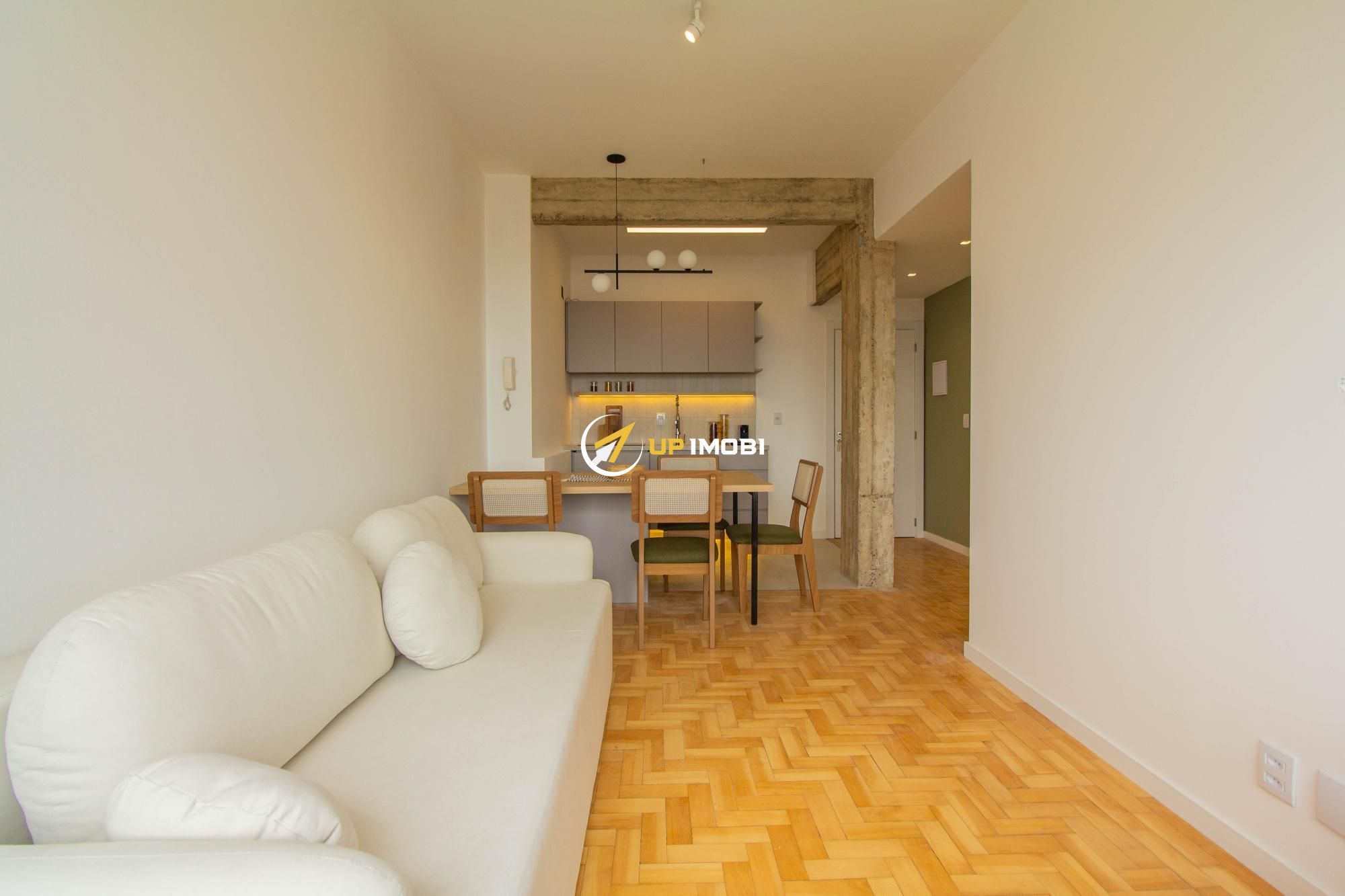 A sala, com piso em parquet, já conta com sofá e poltrona, enquanto a cozinha dispõe de mesa com cadeiras, criando um espaço pronto para viver e receber.