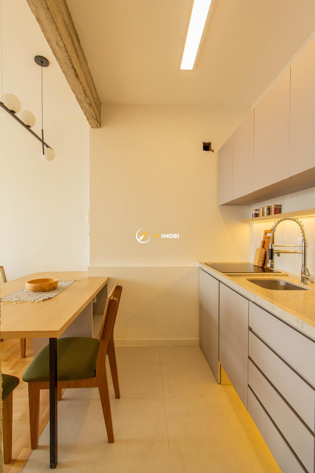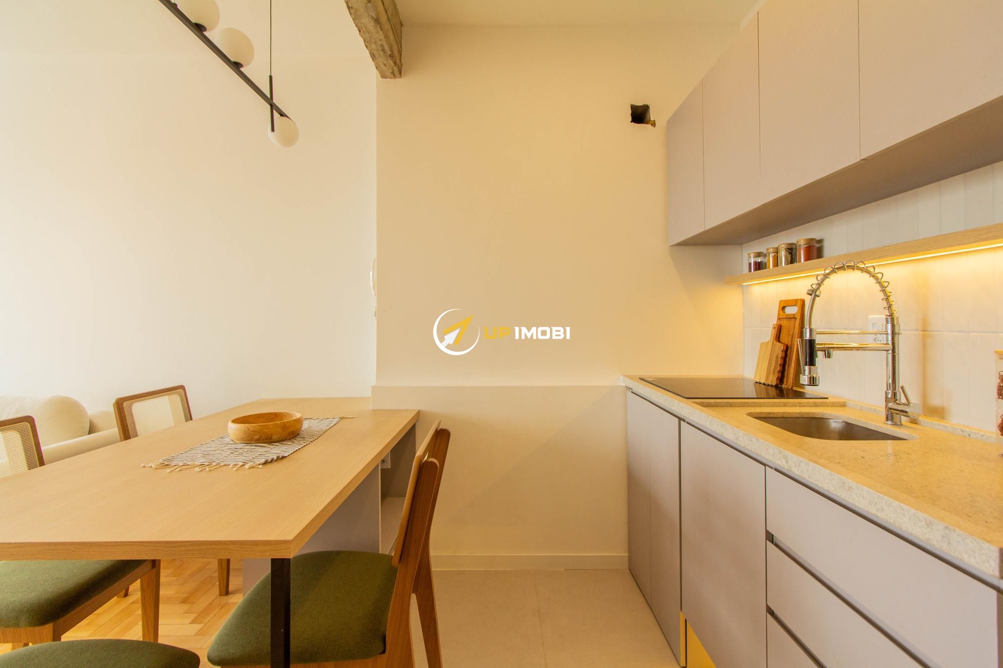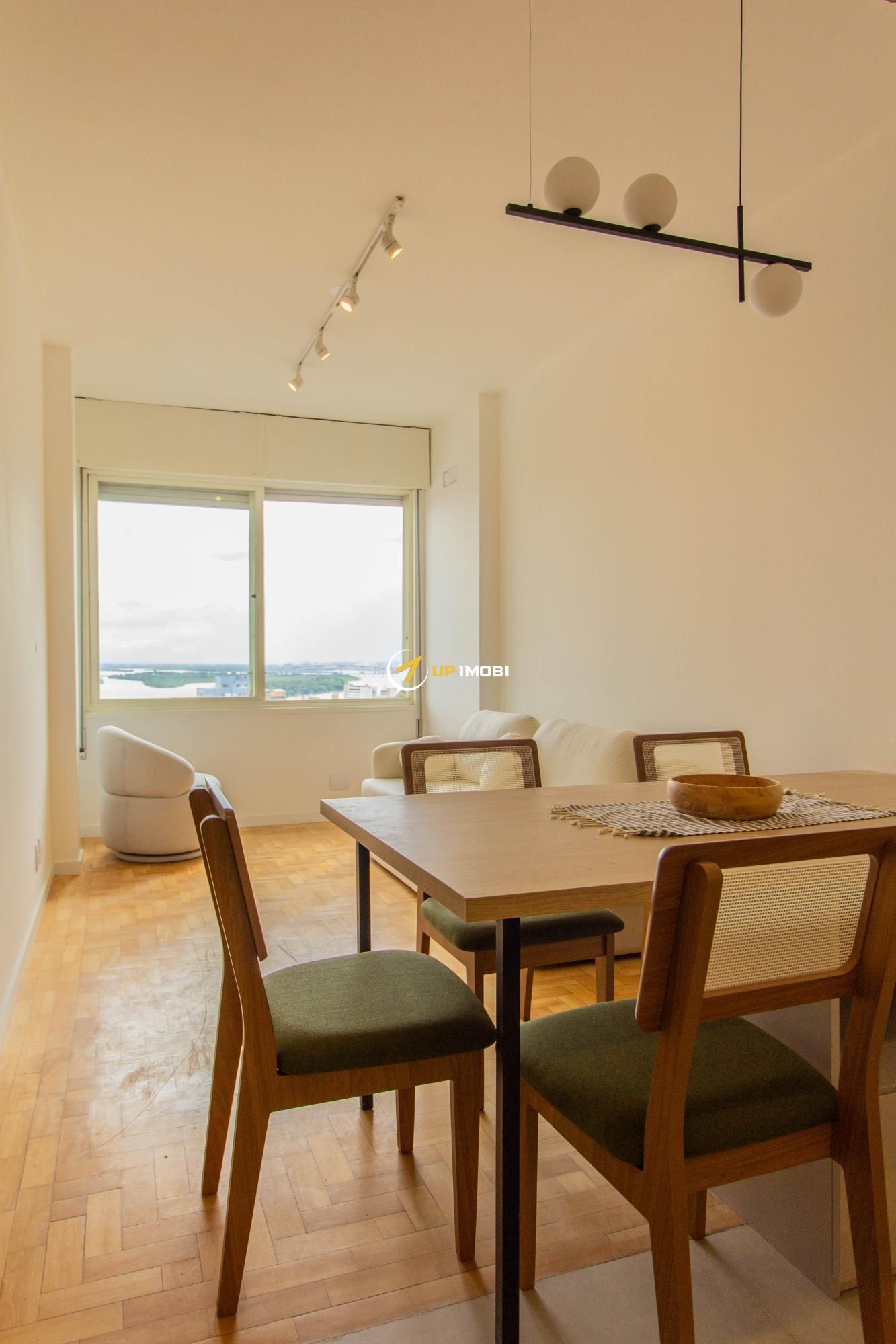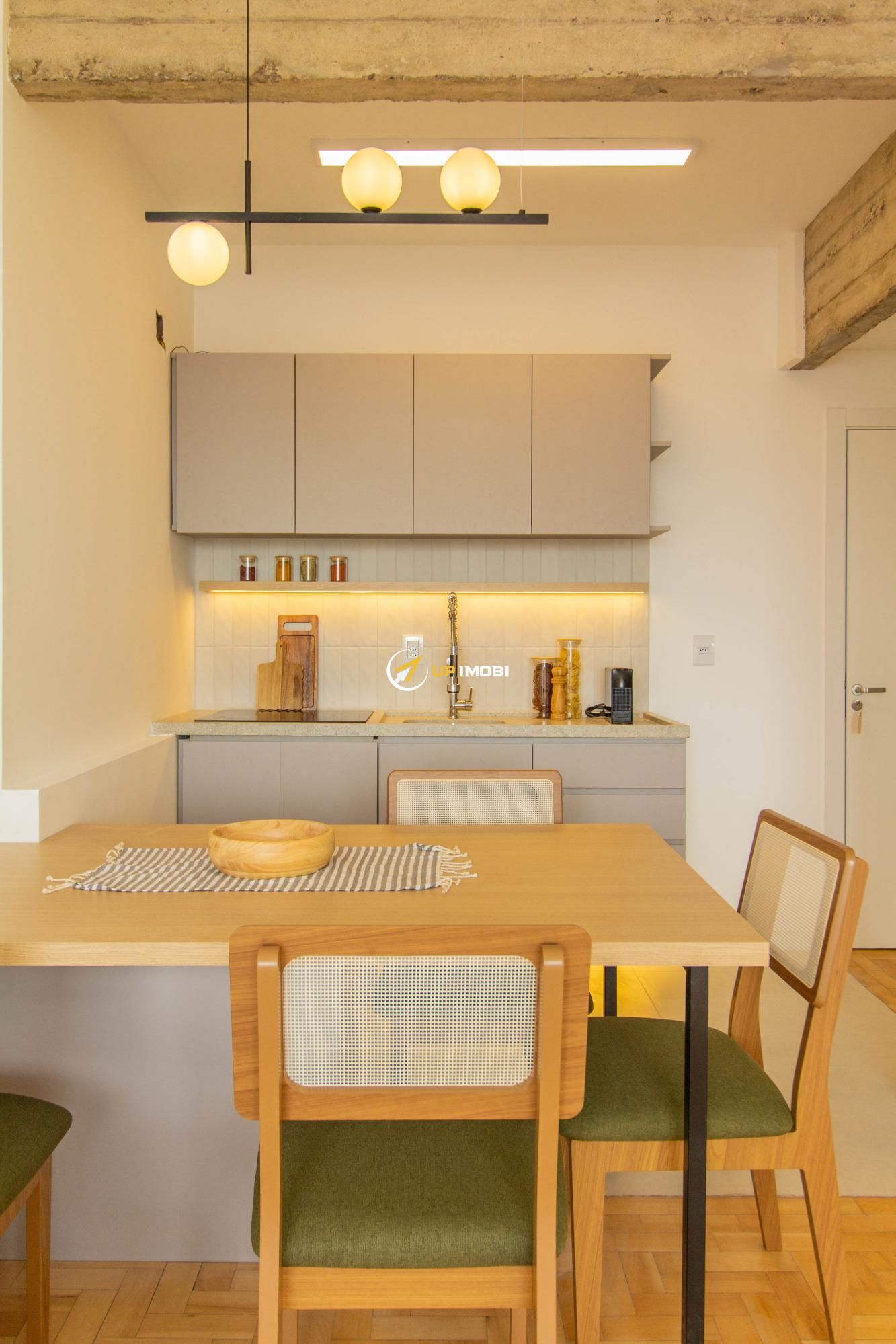 A sala, com piso em parquet, já conta com sofá e poltrona, enquanto a cozinha dispõe de mesa com cadeiras, criando um espaço pronto para viver e receber.