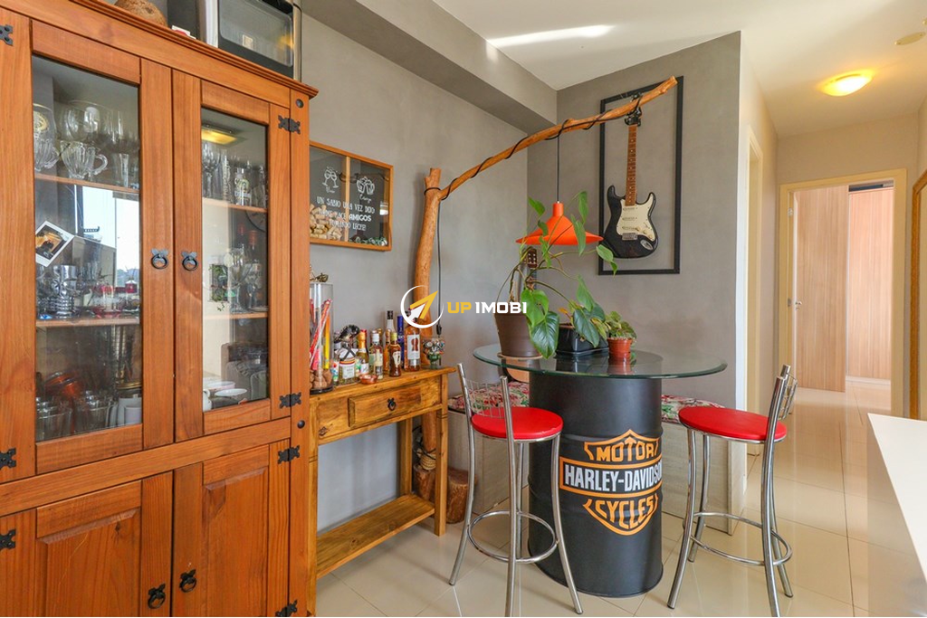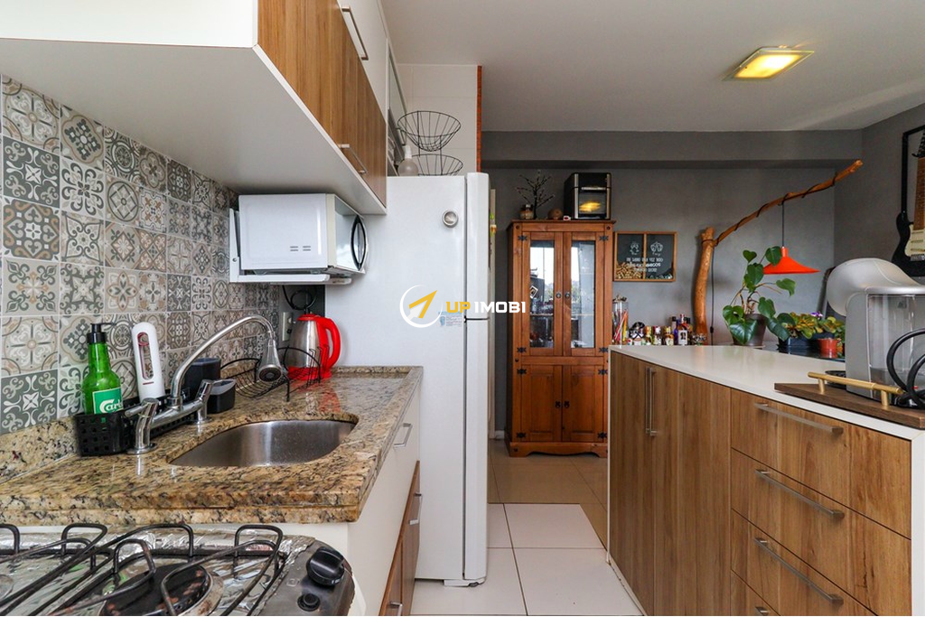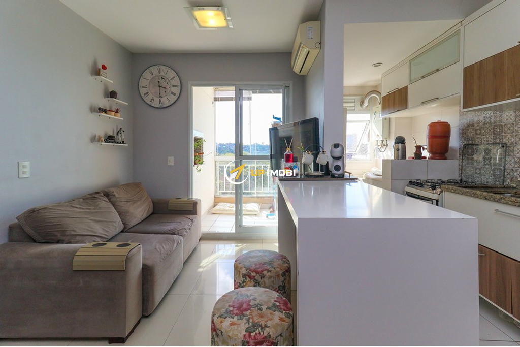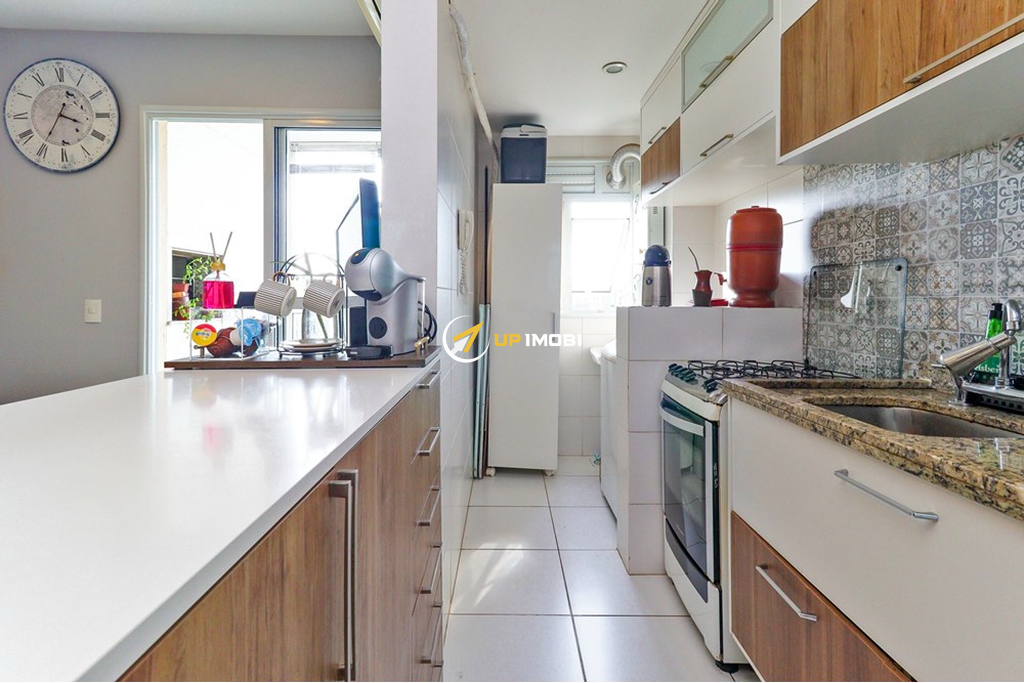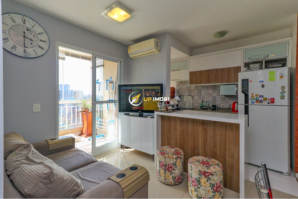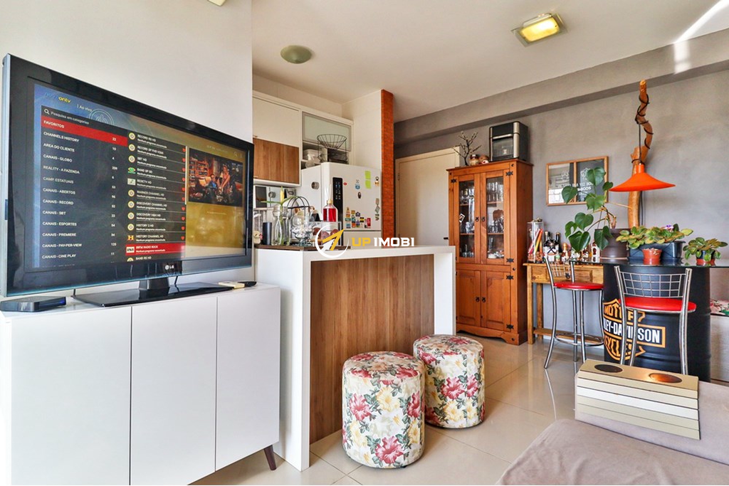 A cozinha americana integrada ao living proporciona um ambiente moderno e funcional. Localizado em andar alto, o apartamento se destaca pela posição solar privilegiada e pela vista livre e panorâmica, garantindo luminosidade natural durante todo o dia.