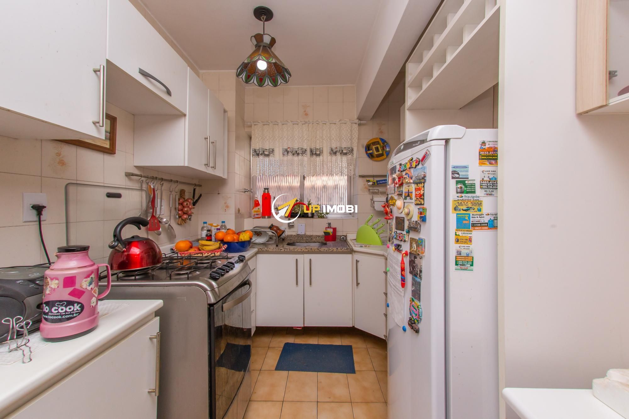 A cozinha é funcional, equipada com armários planejados, uma janela que permite a entrada de luz natural e sol da manhã.