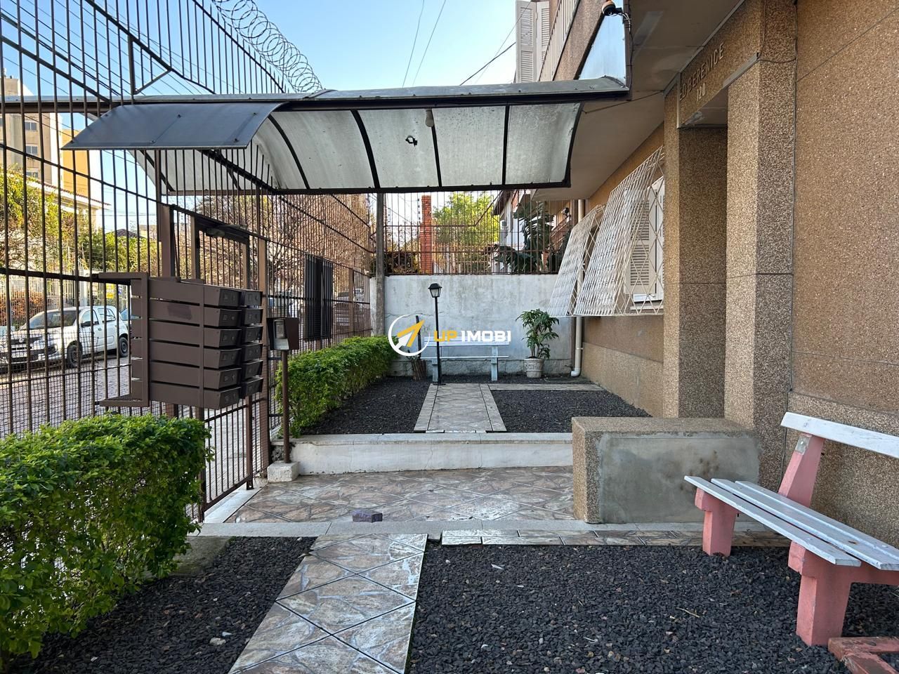 Condomínio em rua calma, com porteiro eletrônico e estacionamento próximo.