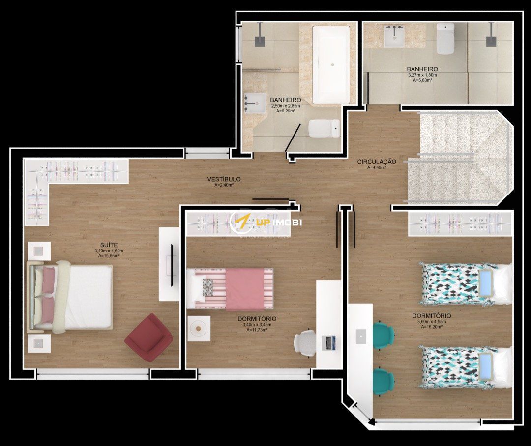No segundo pavimento são 3 dormitórios espaçosos, sendo 1 suíte.