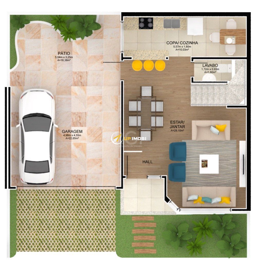 Garagem fechada e coberta para 2 carros e um pequeno pátio com ótima incidência de luz solar.
