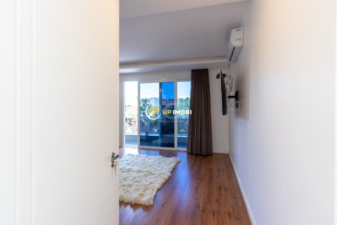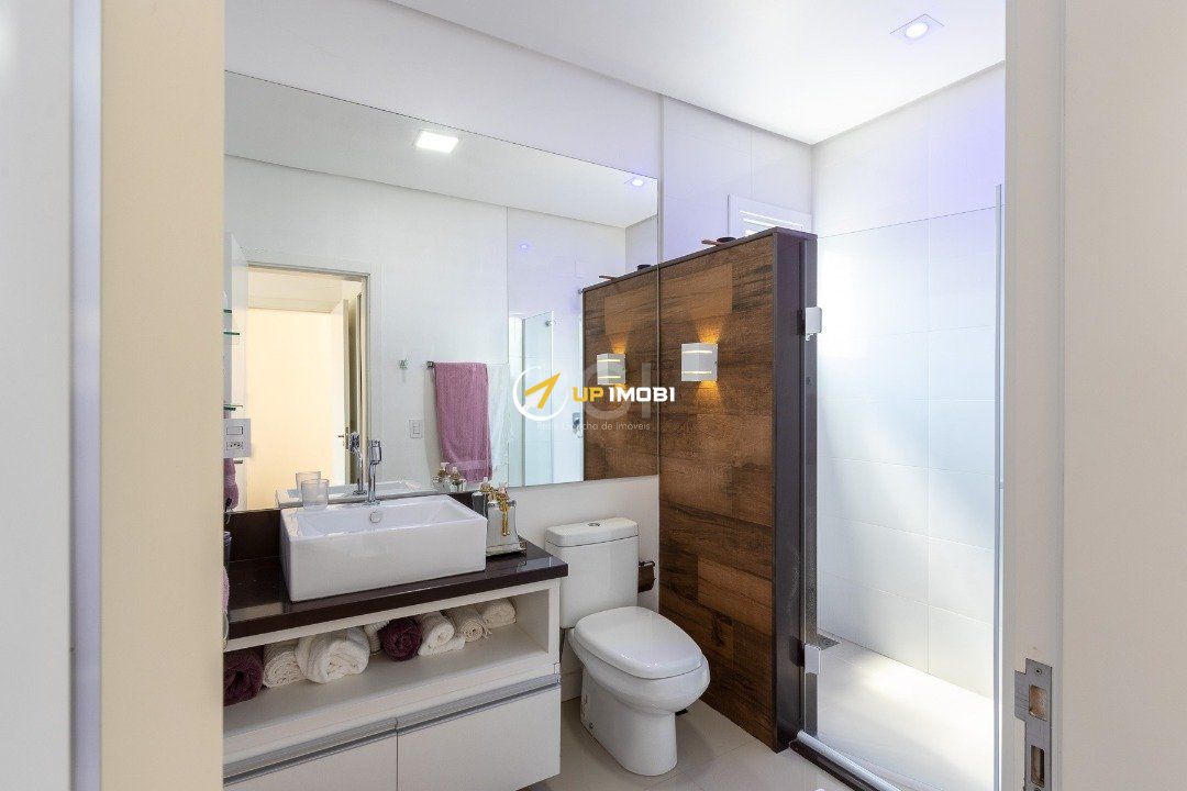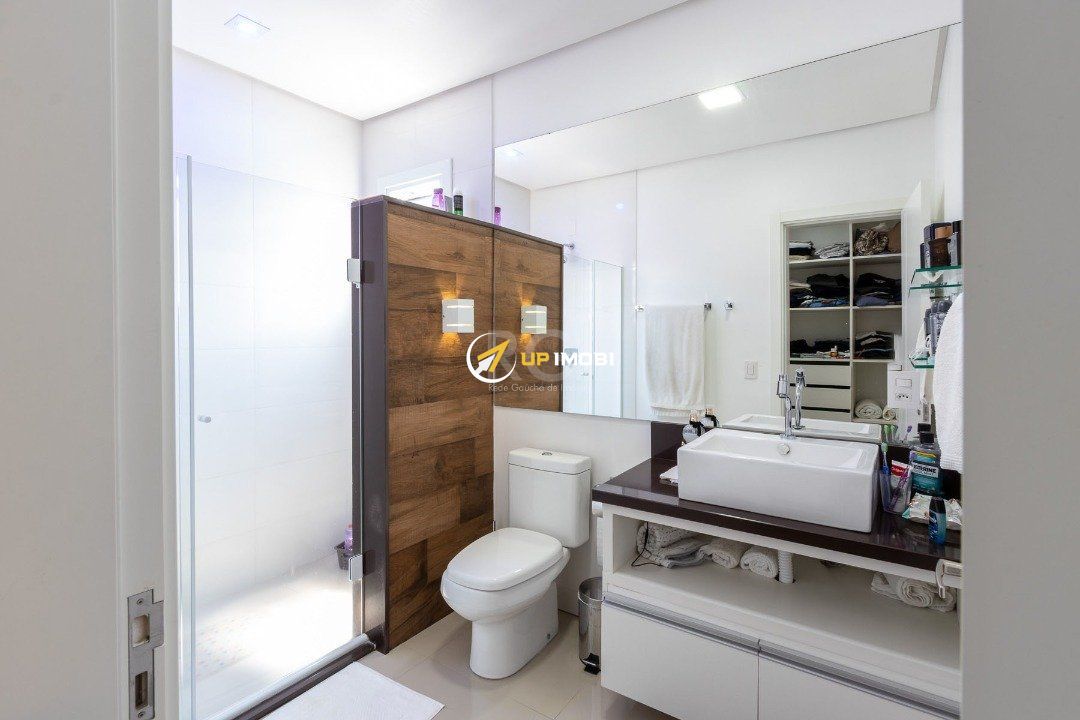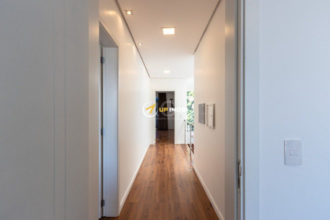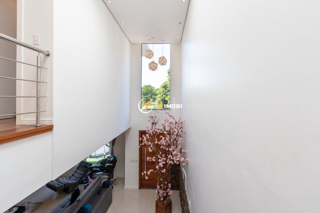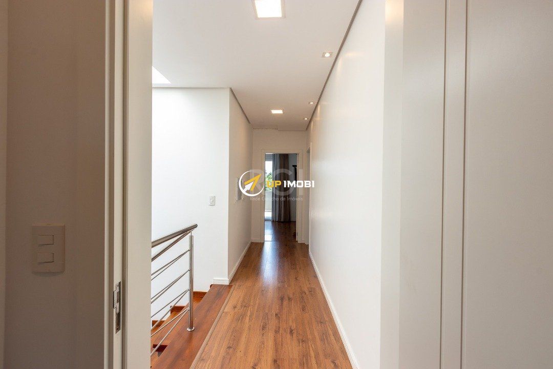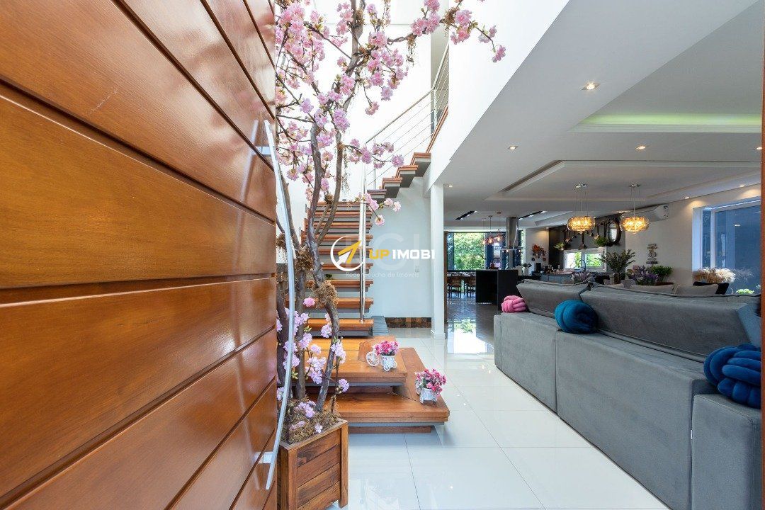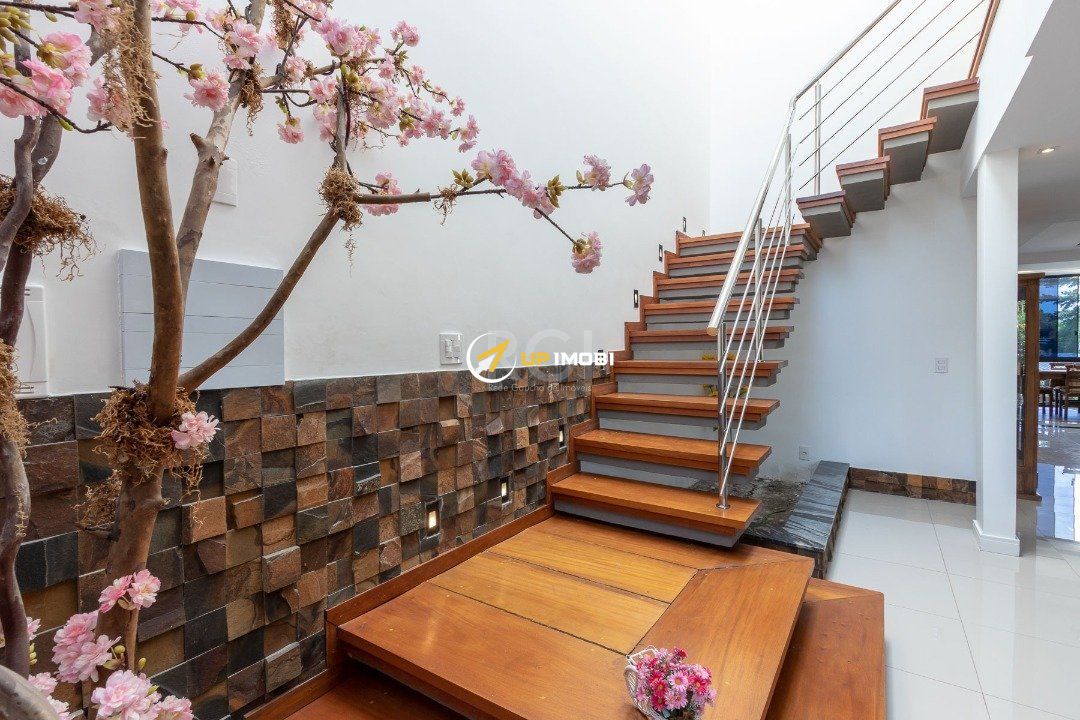 Com uma entrada elegante e sofisticada, você já se depara com uma escada linda, toda em madeira Grapia, cheia de luz natural que vem do teto de vidro, o que dá o charme todo na parede em pé direito duplo.