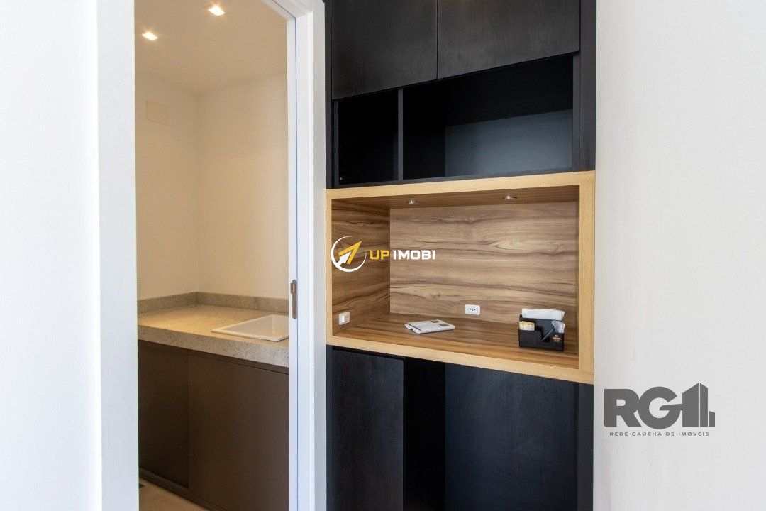 Excelente sala comercial com 32,95m² privativos, mobiliada, com lavabo, copa e com divisórias que formam 3 salas individuais, além de 1 vaga de estacionamento rotativa e coberta.