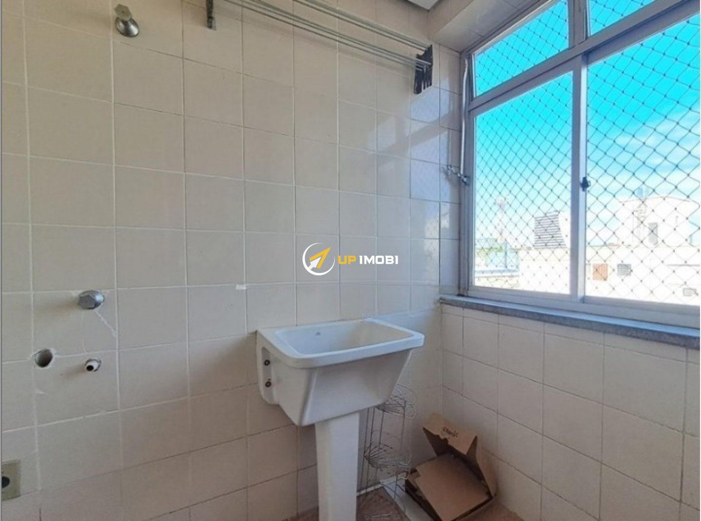 Lavanderia com tanque iluminada e ventilada.