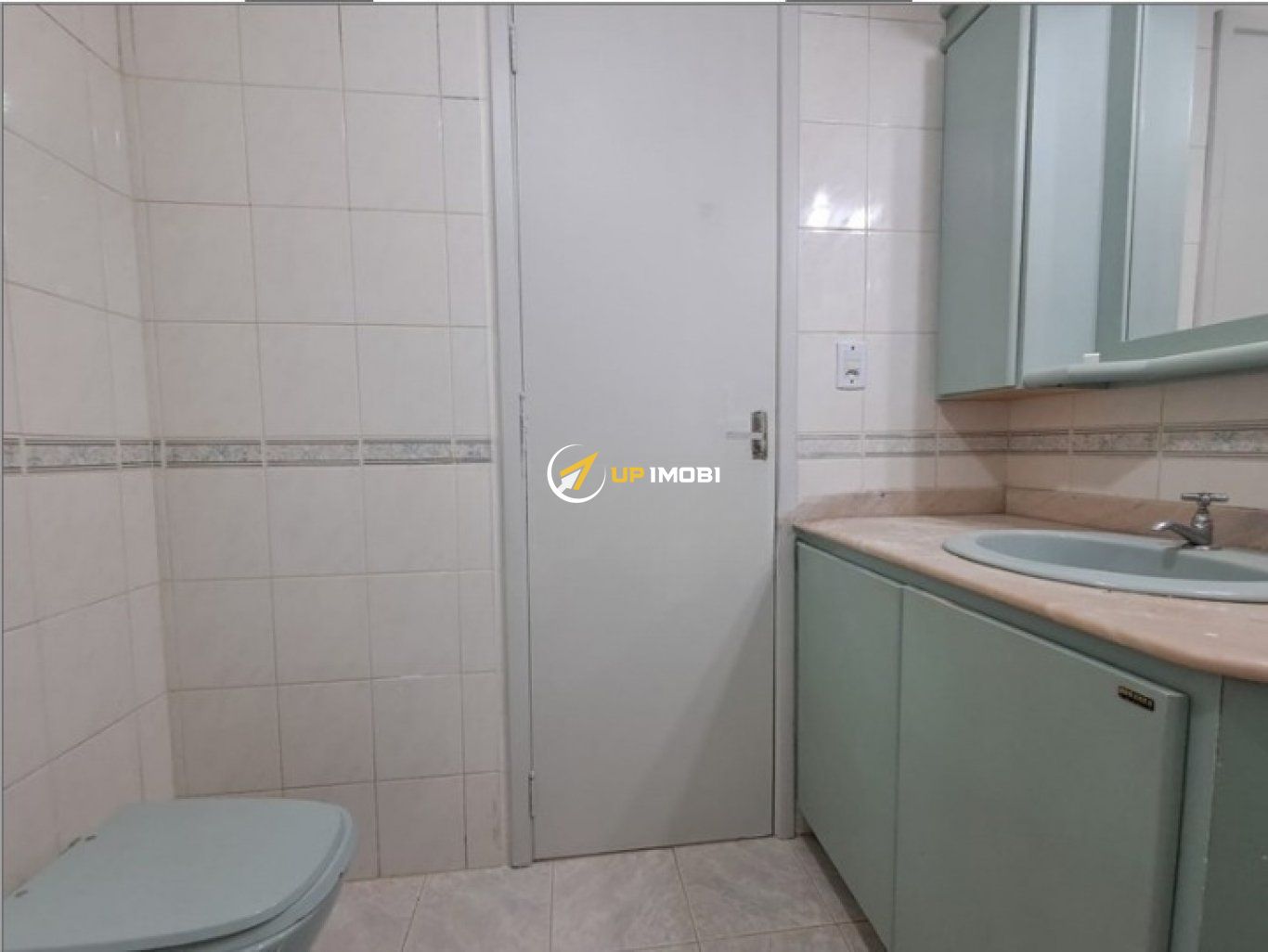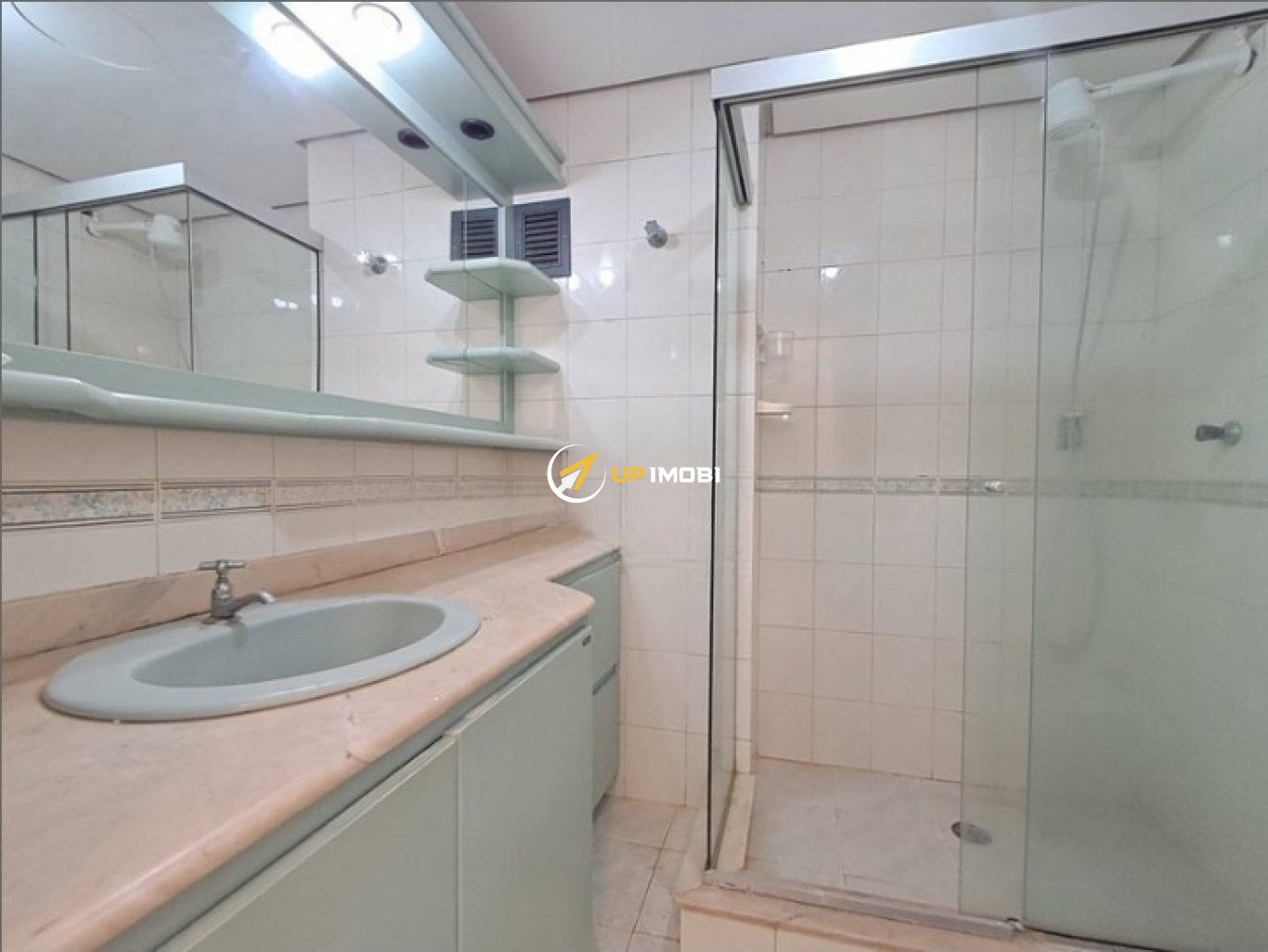 Banheiro é totalmente revestido em cerâmica, conta com box de vidro, armários planejados e ambiente arejado e iluminado.