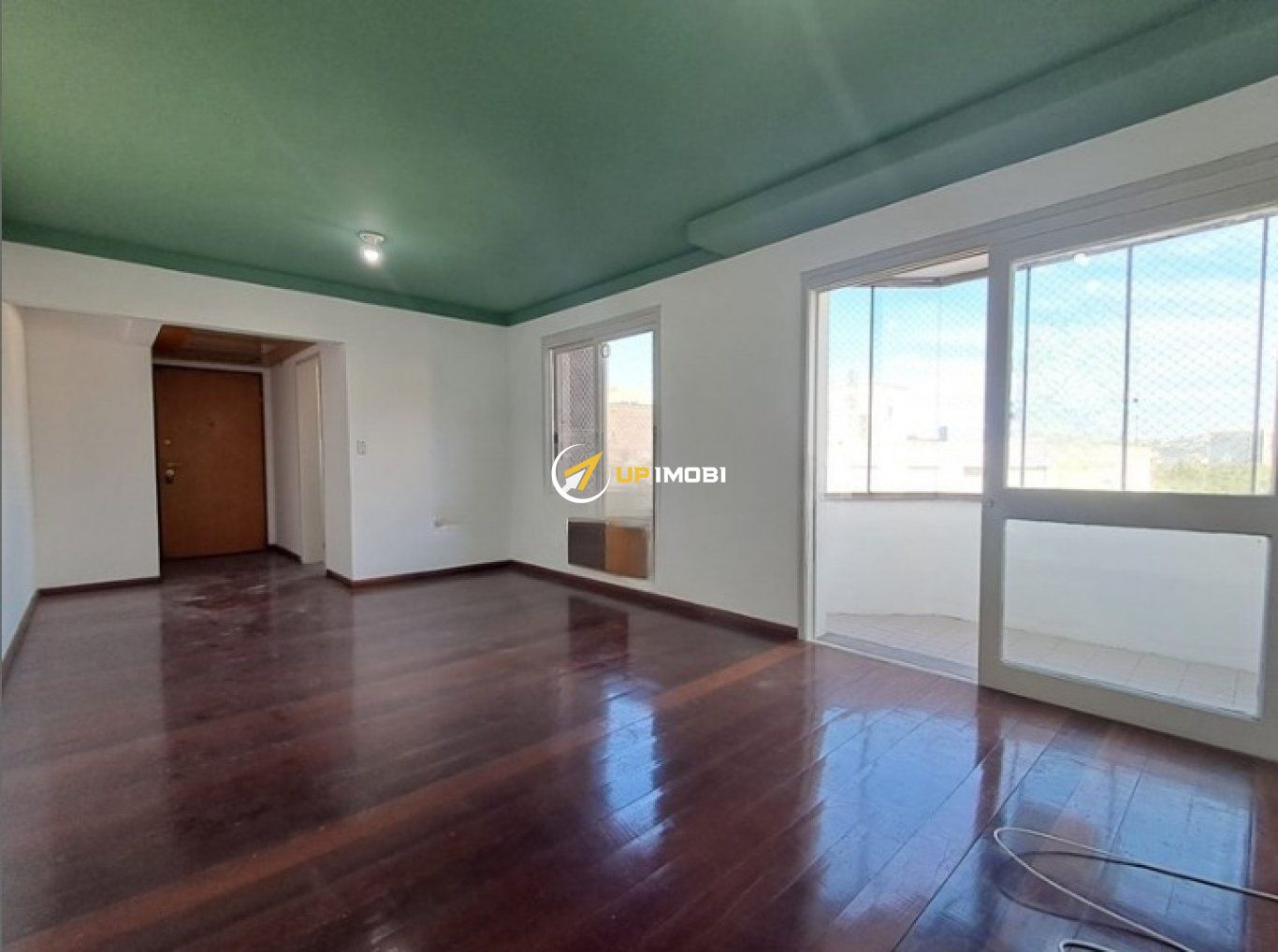 Sala ampla, arejada e iluminada, com piso laminado e pequena varanda.