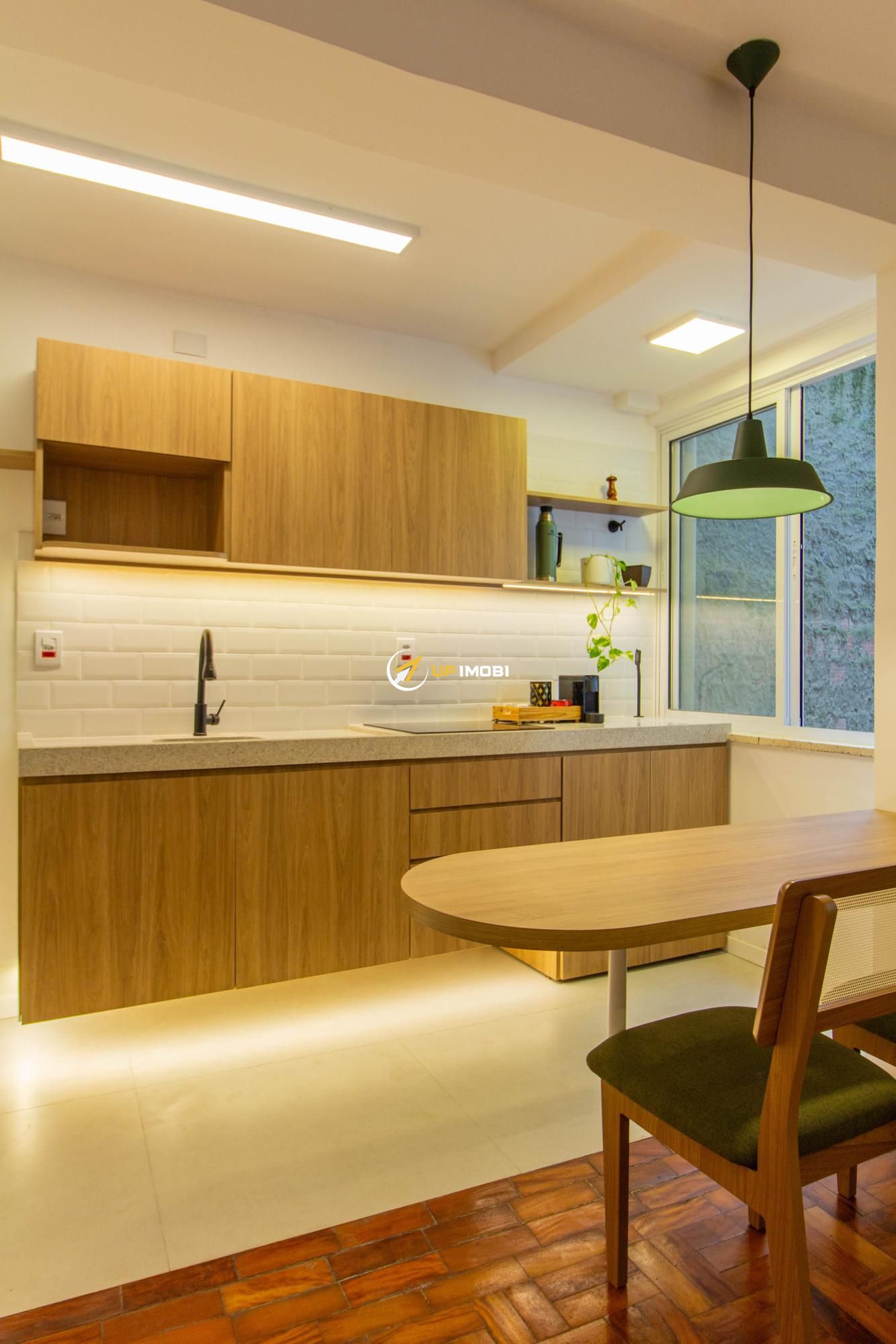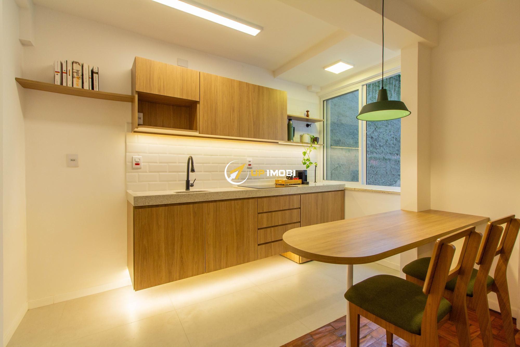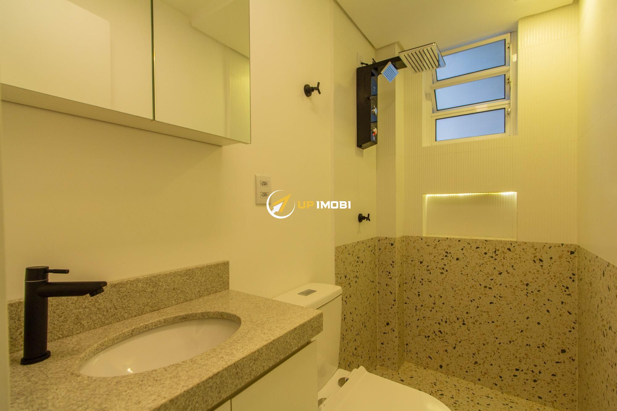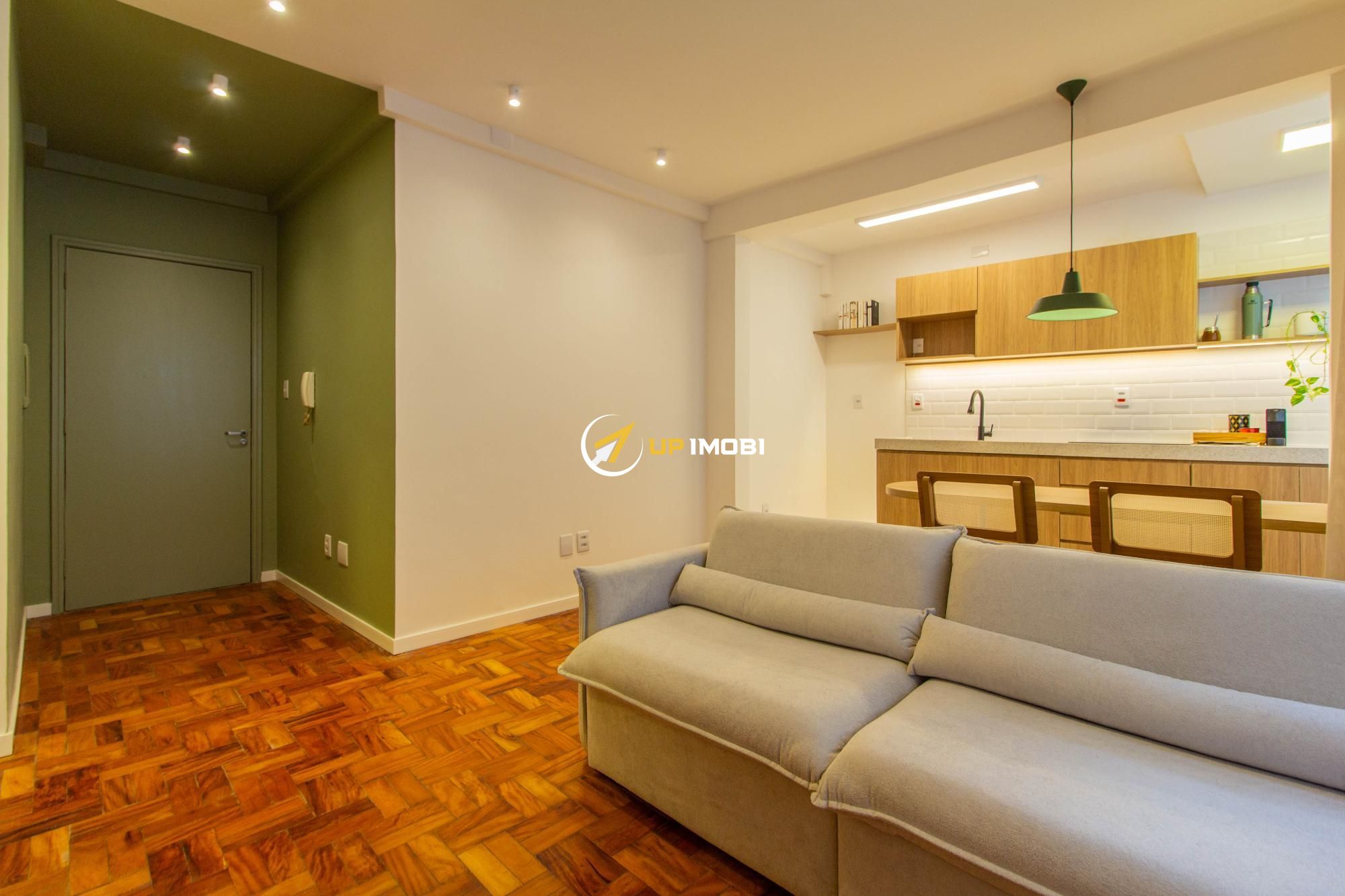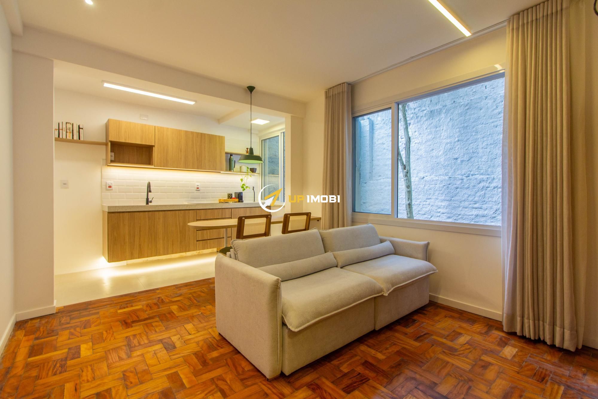 Com 44,73 m² de área privativa, o imóvel apresenta uma planta funcional e bem aproveitada, contando com cozinha americana moderna, integrada ao ambiente social, e banheiro social. A reforma valoriza os espaços e garante um dia a dia mais prático e acolhedor.