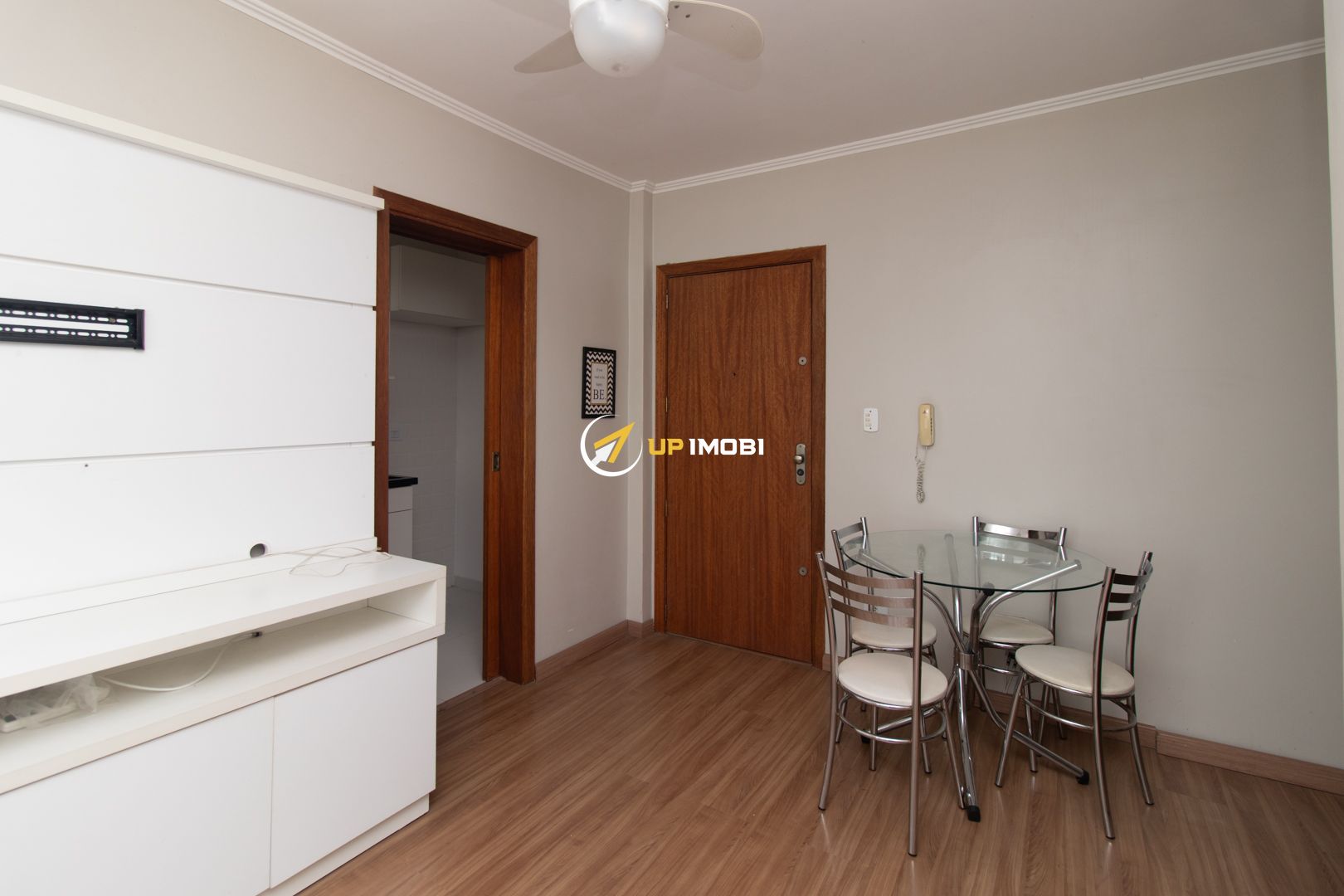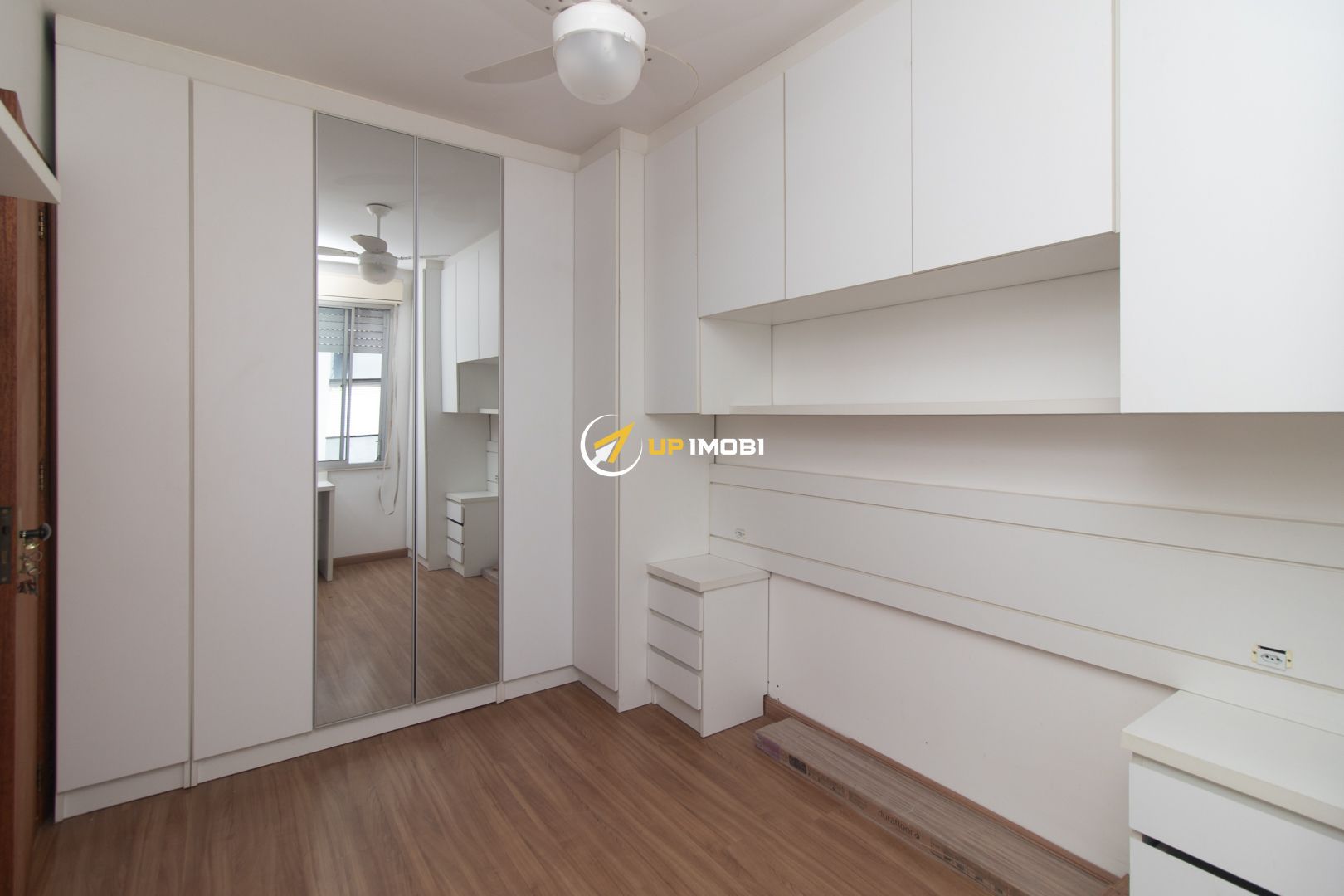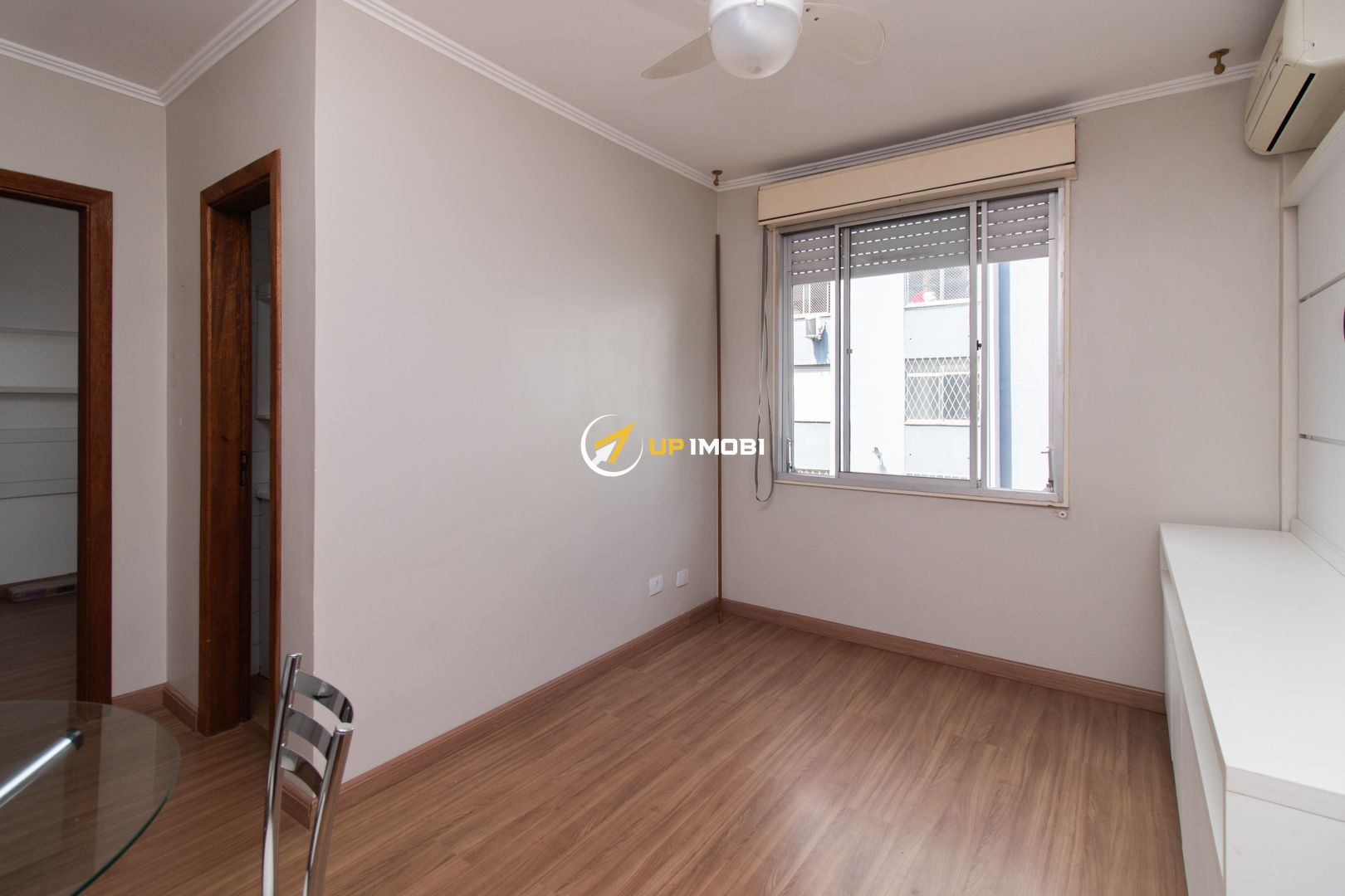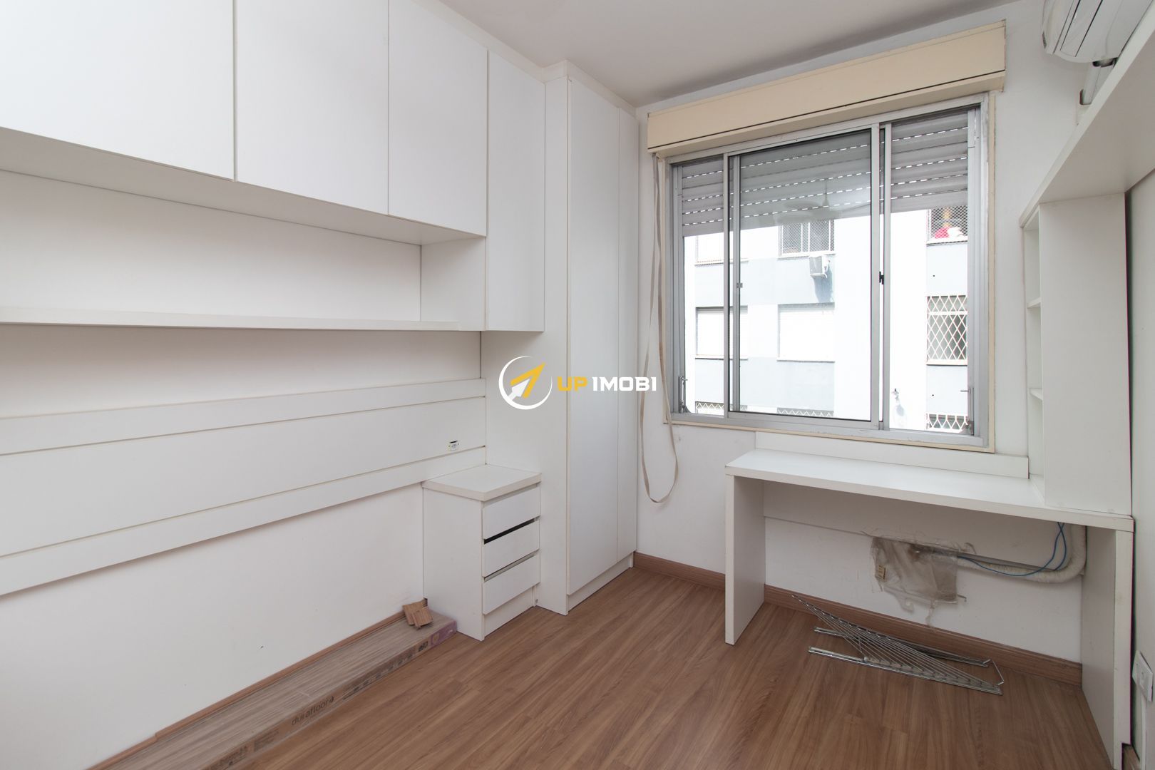 No quarto, os móveis foram projetados para aproveitar cada espaço, incluindo armários, bancada para estudos ou trabalho, painel para TV e cortinas blackout. O banheiro tem ventilação natural e a área de serviço é independente, com varal de teto. O imóvel ainda conta com dois aparelhos de ar-condicionado split e ventiladores de teto, garantindo conforto térmico em todas as estações.
